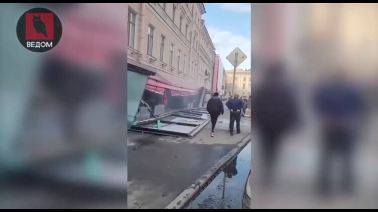 Автор видео показывает помещение сразу после детонации. Из кафе выходят раненные и окровавленные люди. У заведения при этом отвалилась стена пристройки.