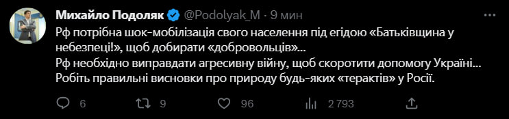"РФ нужна шоковая мобилизация своего населения под эгидой "Родина в опасности!", чтобы набирать добровольцев. РФ нужно оправдать агрессивную войну, чтобы уменьшить помощь Украине. Делайте правильные выводы о характере любых "терактов" в России", - написал он.
