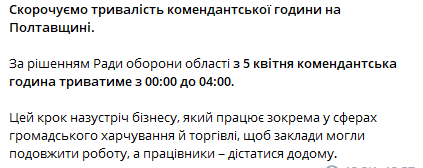 В Полтавской области сокращают комендантский час до минимального по всей Украине. С 5 апреля он будет действовать с 00:00 до 04:00.