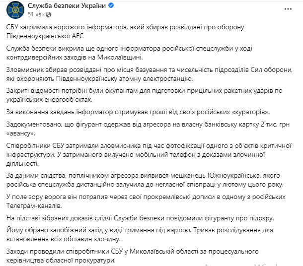 По данным СБУ, "злоумышленник собирал разведданные о местах базирования и численности подразделений Сил обороны, которые охраняют Южно-Украинскую АЭС".