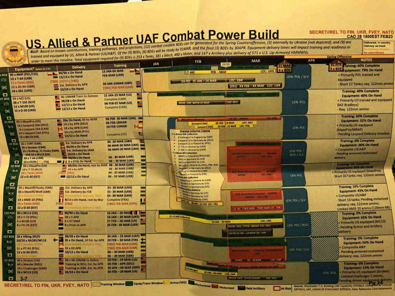 Также в "файлах Пентагона" указывается, что в общей сложности для девяти бригад требовалось более 250 танков и более 350 механизированных машин. Указано, какие бригады из них получают и сроки поставок.