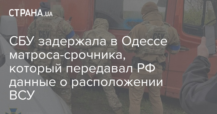 СБУ сообщает о задержании в Одессе срочника Военно-морских сил Украины, который, по версии следствия, передавал российским военным данные о дислокации штаба, боевой техники и складов боеприпасов, а также пытался зафиксировать расположение установок Himars.