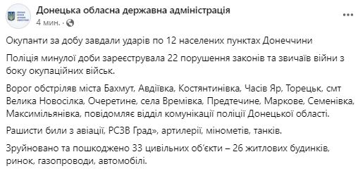 В Контстантиновке ракетными ударами повреждены семь многоэтажек и газопровод. Поврежден дом в Марково, три дома в Торецкой громаде. Также повреждены хозпостройки в Ямполе и дома в Северске.