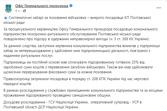 Сотрудника полтавского похоронно-ритуального предприятия коммунальной собственности подозревают в систематическом получении взяток за перевозку тел и захоронение погибших украинских военных.