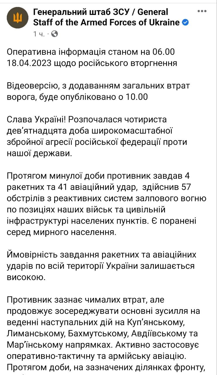 Генштаб ВСУ опубликовал утреннюю сводку с фронта. В течение суток было отражено более 70 атак противника.