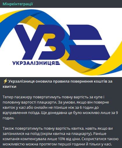 УЗ обновила правила возврата средств за билеты. Как сообщает Минреинтеграции, теперь пассажиру будут возвращать полную стоимость за купе и половину стоимости плацкарта.