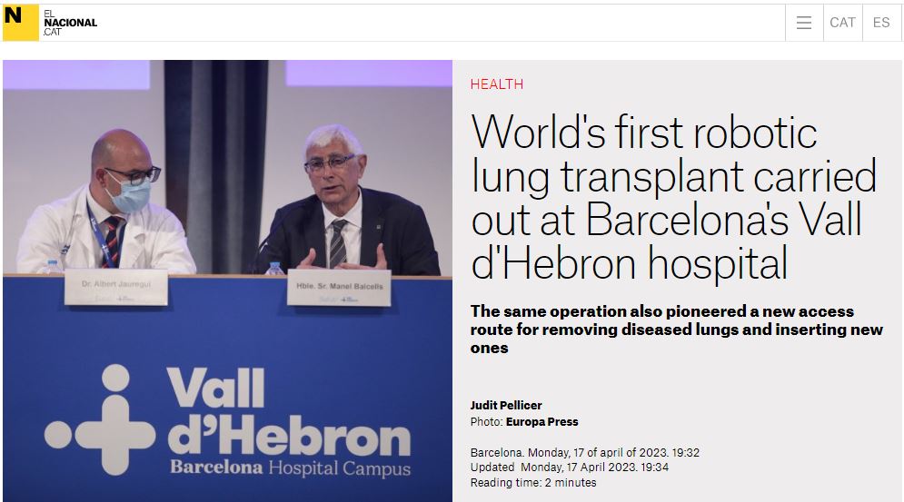 #Breakthrough: #VallHebron hospital achieves the first fully robotic lung transplant with a new access route: the new technique has allowed replacing the traditional 30-centimetre incision in the thorax with small incisions of just a few centimetres