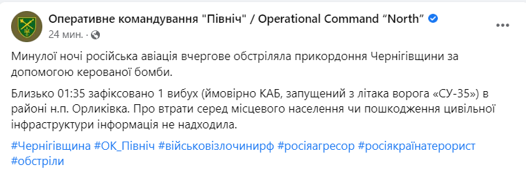 "Около 01:35 зафиксирован 1 взрыв (вероятно, КАБ, запущенный с самолета врага СУ-35) в районе н.п. Орликовка. О потерях среди местного населения или повреждении гражданской инфраструктуры информация не поступала", - заявили военные.