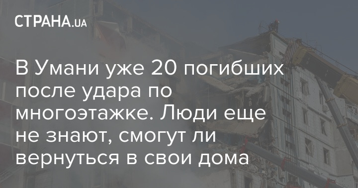Число погибших в Умани Черкасской области в результате сегодняшнего ракетного удара возросло до 20 человек. Еще 18 — ранены, 9 из них находятся в больнице.