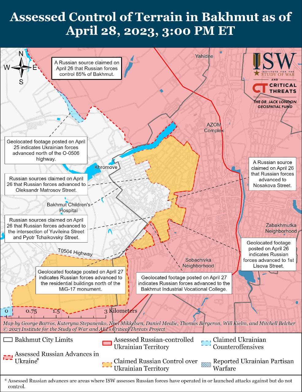"Институт изучения войны" (США) проанализировал фото и видео с фронта. Кадры, опубликованные 28 апреля, показывают, российские войска продвигаются под Кременной. На фото армию РФ видно примерно в 10 километрах к северо-западу от города.