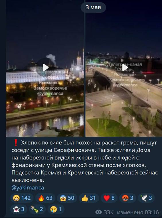 Первым об ударе по Кремлю сообщил небольшой телеграм-канал "Соседи.Якиманка.Замоскворечье" в 3.16 утра по киевскому времени со ссылкой на очевидцев.