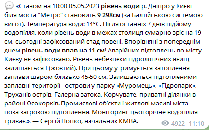 При этом удерживается затопление поймы слоем около 45-50 см. Продолжают оставаться подтопленными пойменные территории, включая острова в парке "Муромец", "Гидропарк", Труханов остров, Галерный залив, Корчеватое, а также некоторые частные участки в районе Осокорков.
