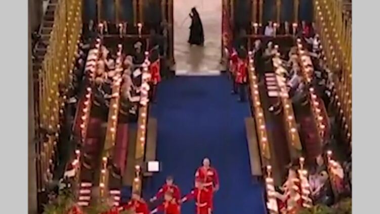 На коронации британского короля Карла III заметили загадочную фигуру в черном. Скриншот видео