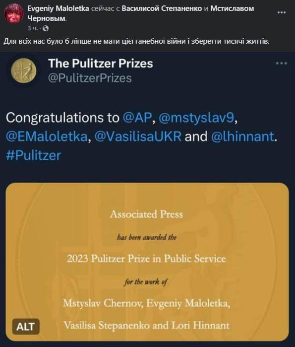 Напомним, что Пулитцеровскую премию получили украинские сотрудники Associated Press - Мстислав Чернов, Евгений Малолетка, Василиса Степаненко и Лори Хиннант. Премию вручили за "смелые репортажи из осажденного Мариуполя, ставшие свидетельствами резни мирных жителей во время вторжения России в Украину".