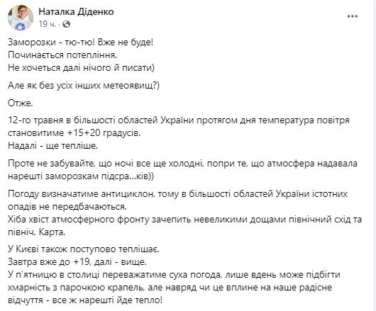 Синоптик Наталья Диденко пишет, что 12 мая в большинстве областей Украины в течение дня температура воздуха будет составлять +15...+20. В дальнейшем – еще теплее.