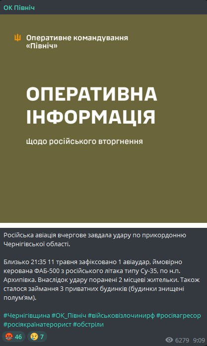 Ночью 12 мая РФ ударила по приграничной Архиповке в Черниговской области управляемой бомбой ФАБ-500.