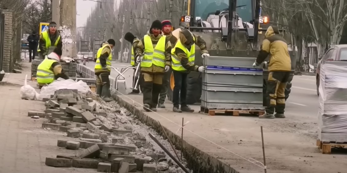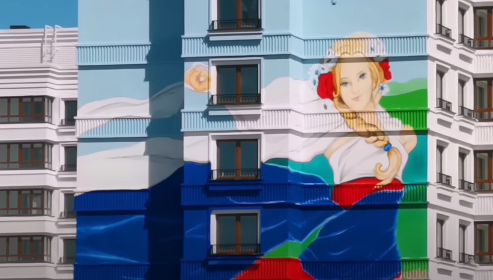 То, что все же отстраивают россияне, громко рекламируется. Новый квартал, который во время поездки посещал Путин, называется ЖК Невский (тоже отсылка к Петербургу). На его фасаде нарисовали девушку в цветах триколора.
