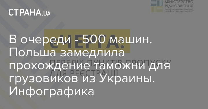 "Вчера на таможенном пункте Рава Русская - Гребенне за сутки пропустили всего три грузовика, а в очереди стоит 500 машин. Такими темпами мы можем простоять на границе еще несколько месяцев. Поляки в свою очередь о причинах задержки не сообщают",- рассказывать перевозчик. Эти заявления также подтверждаются данными из электронной очереди по пересечению границы "єЧерга".