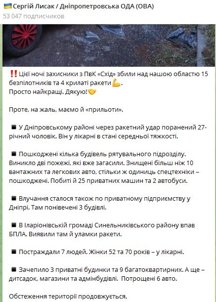 - Попадание произошло также по частному предприятию в Днепре. Там повреждены три здания.