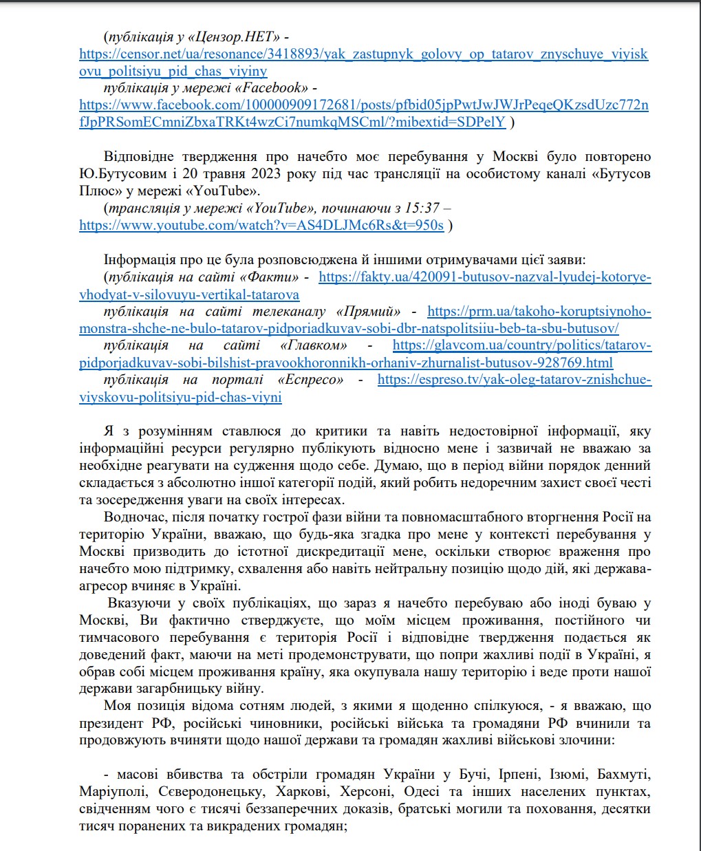 "Моя позиция известна сотням людей, с которыми я ежедневно общаюсь: я считаю, что президент РФ, российские чиновники, российские войска и граждане РФ совершили и продолжают совершать в отношении нашего государства и граждан ужасные военные преступления", – заявил Портнов.