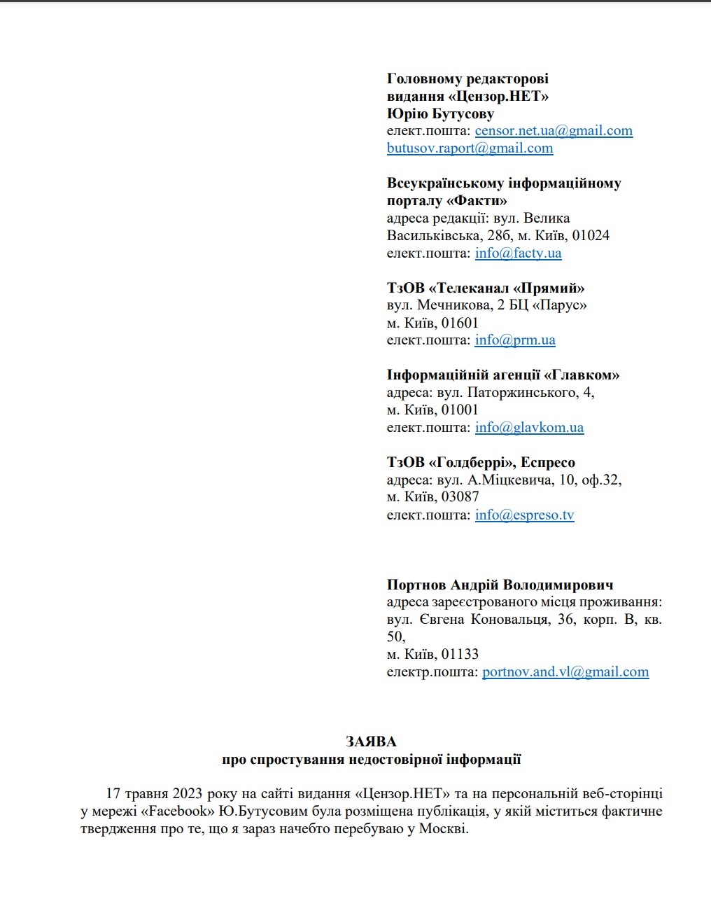 Об этом говорится в его заявлении, которое он разослал СМИ в ответ на сообщения о том, что он якобы уехал в Москву (об этом медиа писали со ссылкой на главреда сайта "Цензор" Юрия Бутусова).
