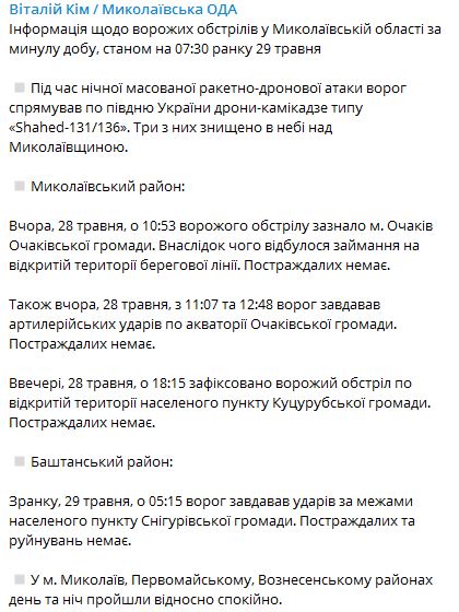 Об этом сообщил глава Николаевской ОВА Виталий Ким в сводке на утро 29 мая.