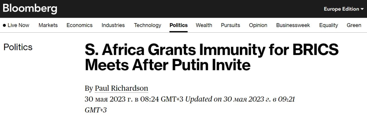 Издание сообщает, что ЮАР предоставит лидерам стран БРИКС дипломатический иммунитет.