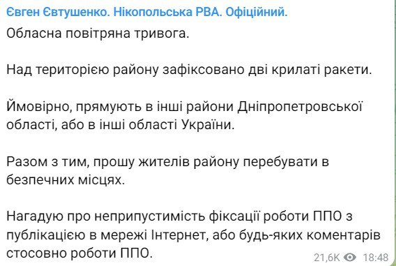 18.52 Глава Никопольского района Евгений Евтушенко сообщает о двух ракетах, летящих над Днепропетровской областью.