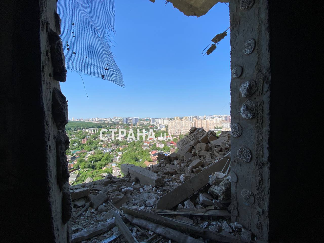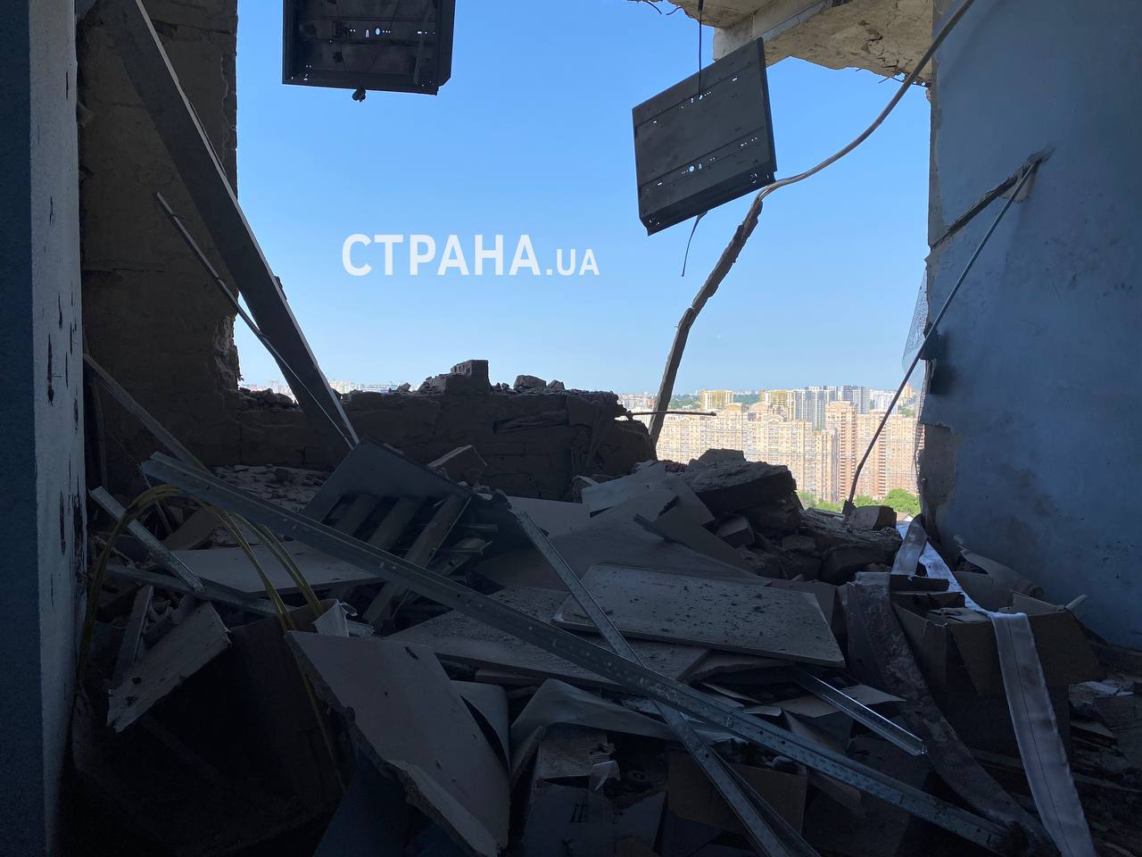 Появились кадры с разрушенных этажей многоэтажки в Голосеевском районе Киева, на которую упали обломки российского дрона.