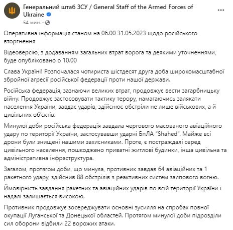 В среду, 31 мая, Генштаб ВСУ опубликовал сводку о ситуации на фонте.