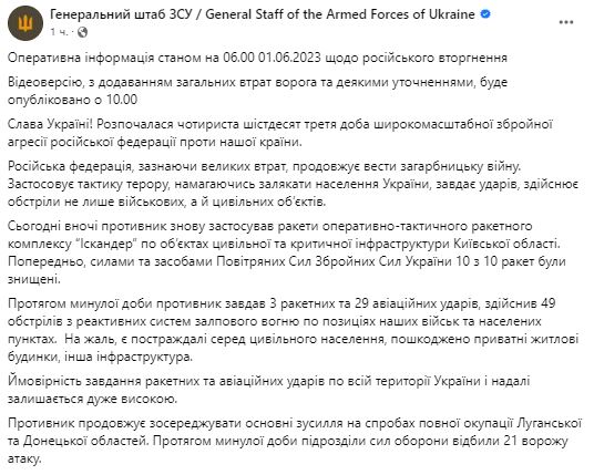 1. Ночью РФ снова применила ракеты комплекса "Искандер" по объектам гражданской и критической инфраструктуры Киевской области. Предварительно 10 из 10 ракет были уничтожены.