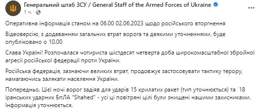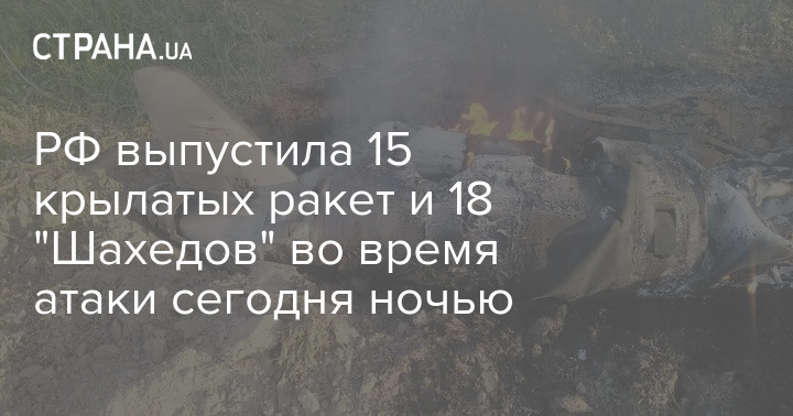 Предварительно этой ночью силы РФ запустили по Украине 15 крылатых ракет и 18 "Шахедов".