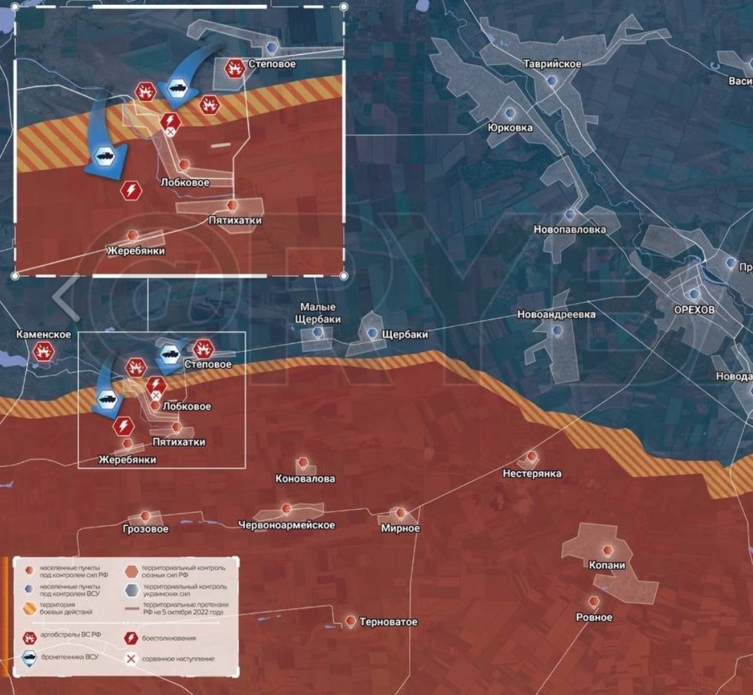 При этом если в предыдущие дни шли сообщения о наступлении на южном участке фронта в Донецкой области (на Времьевском выступе под Великой Новоселкой, в районах Нескучного и Новодонецкого, а также Угледара), то сегодня пошли сообщения о наступлении ВСУ в Запорожской области: в районе населенного пункта Лобковое (около Каховского водохранилища) и чуть восточнее - в районе Орехова.