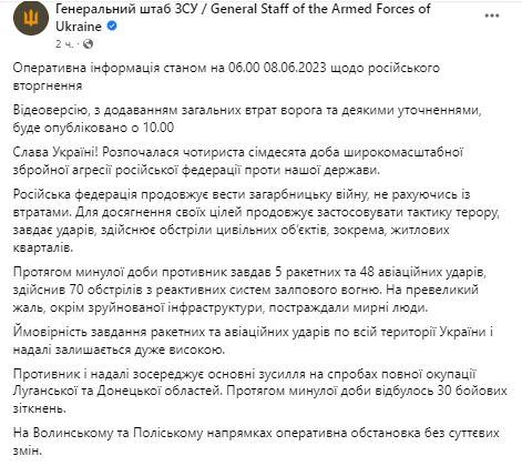 Утром 8 июня Генштаб ВСУ обнародовал сводку о ситуации на фронте.