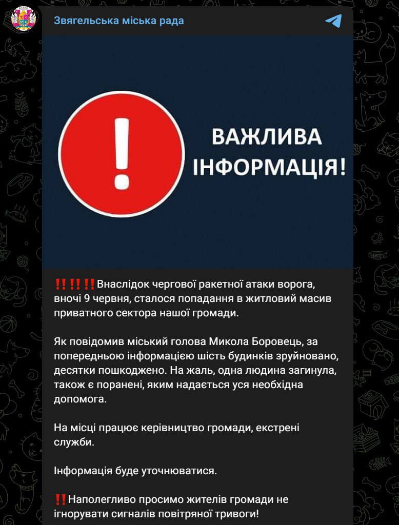 08.05 Губернатор Житомирской области Бунечко уточняет, что по Звягелю был не прилет, а падение обломков ракеты.
