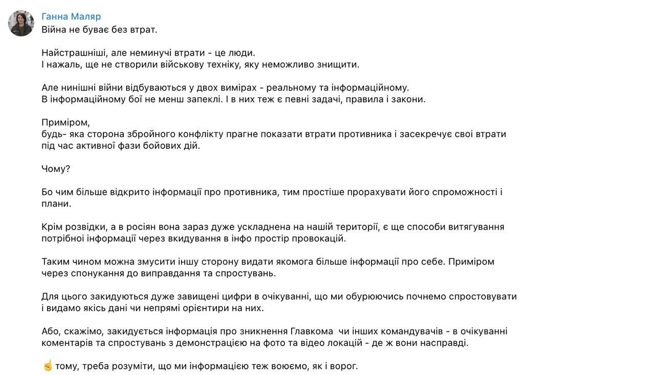 "Война не бывает без потерь. Самые страшные, но неизбежные потери – это люди. И, к сожалению, еще не создали военную технику, которую невозможно уничтожить", - написала она, но дала понять, что заявленные РФ цифры по украинским потерям завышены.