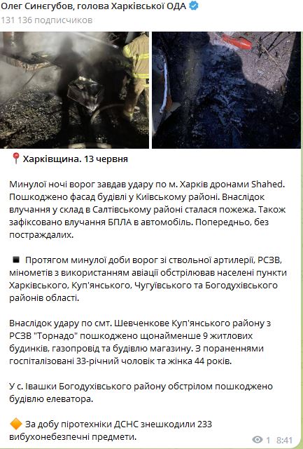 Поврежден фасад здания в Киевском районе. В результате попадания в склад в Салтовском районе произошел пожар. Также зафиксировано попадание БПЛА в автомобиль. Предварительно, обошлось без пострадавших.