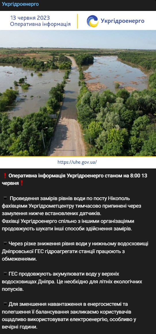 Кроме того, из-за резкого снижения уровня воды в нижнем водохранилище Днепровской ГЭС гидроагрегаты станции работают с ограничениями.