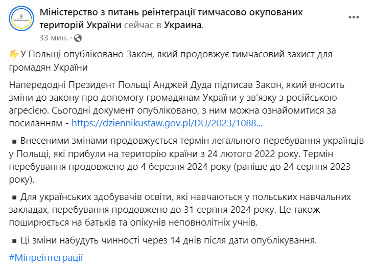 В Польше опубликован Закон, который продлевает временную защиту для граждан Украины. Фото: Facebook