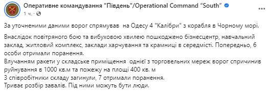 После попадания ракеты в складское помещение одной из торговых сетей произошло разрушение на площади 1000 кв.м и пожар на площади 400 кв. м. Три сотрудника склада погибли, семь получили ранения.