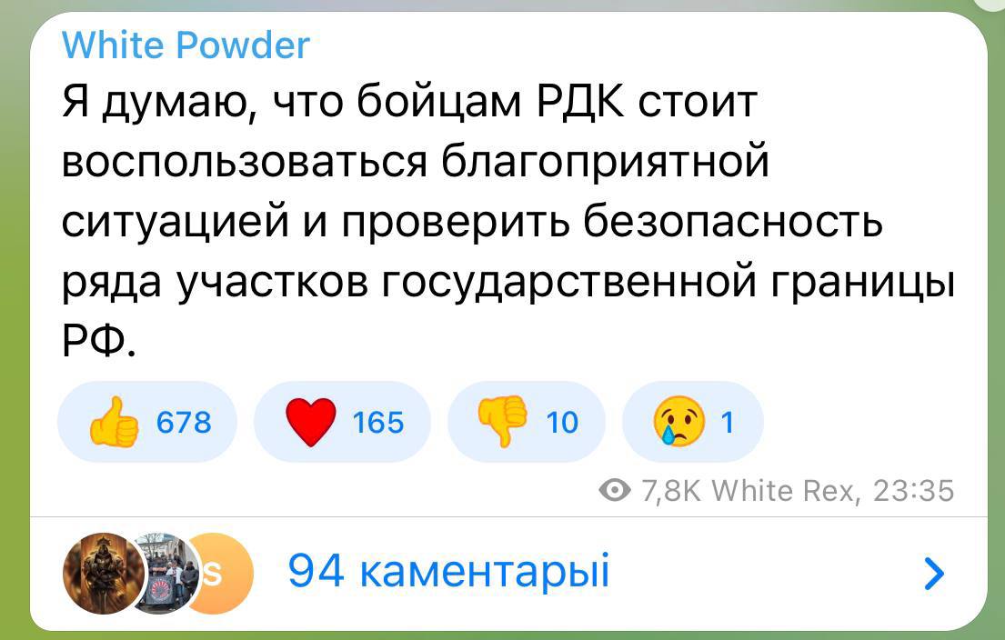00.49 Представители воюющего на стороне Украины "Русского добровольческого корпуса" также с воодушевлением восприняли действия Пригожина. Готовятся к новым рейдам на территорию РФ.