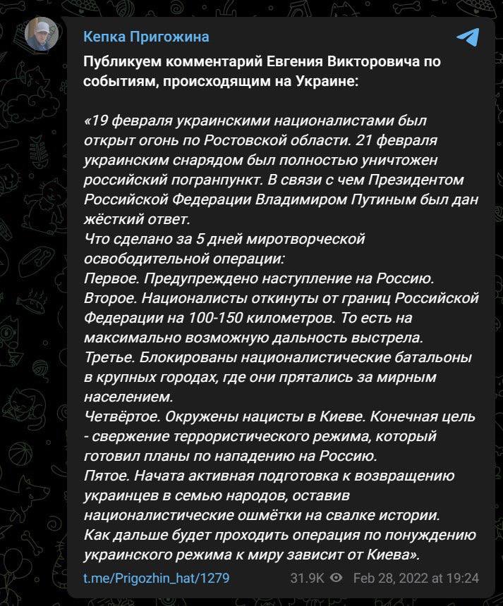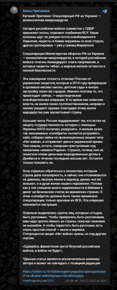 То есть Пригожин максимально наращивает "зрадную" риторику, за которую в России других отправляют под суд. Все это уже вызывает недоумение у ранее поддерживавших Пригожина российских военных пабликов. Последние уже подозревают куратора "Вагнера" в работе на Украину для подъема боевого духа в украинском обществе и для деморализации общества и армии РФ.