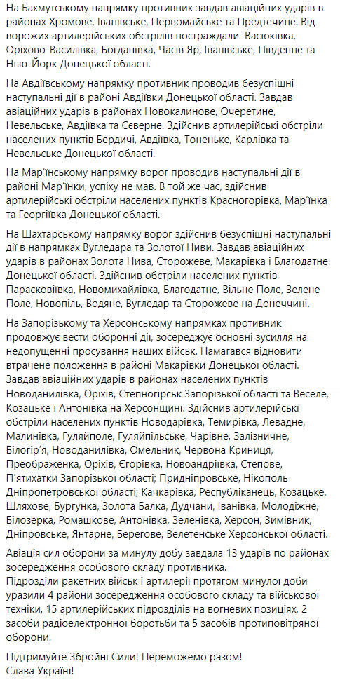 7. Авиация и подразделения ракетных войск и артиллерии ВСУ продолжают активные действия против врага. За минувшие сутки авиация сил обороны нанесла 13 ударов по районам сосредоточения личного состава противника. Подразделения ракетных войск и артиллерии за прошедшие сутки поразили 4 района сосредоточения личного состава и военной техники, 15 артиллерийских подразделений на огневых позициях, 2 средства радиоэлектронной борьбы и 5 средств ПВО.