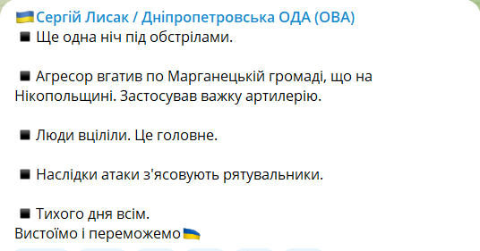 Также сегодня ночью войска РФ ударили из тяжелой артиллерии по Марганецкой общине Никопольщины, люди не пострадали.