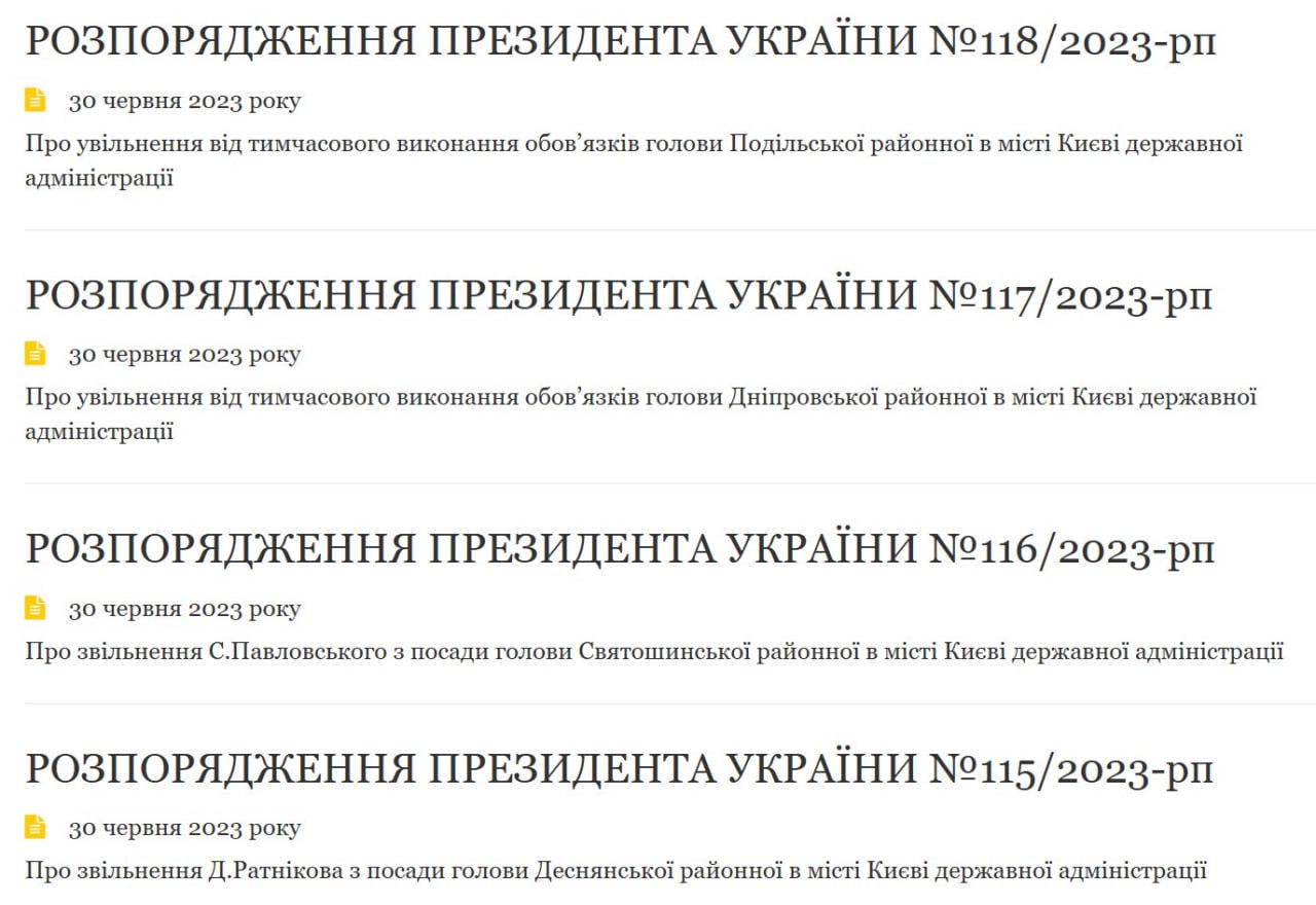 В частности, в Святошинском районе сняли с должности Сергея Павловского, а в Деснянском - Дмитрия Ратникова.
