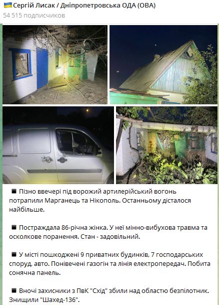 Ночью 3 июля под вражеский артиллерийский огонь РФ попали Марганец и Никополь в Днепропетровской области.