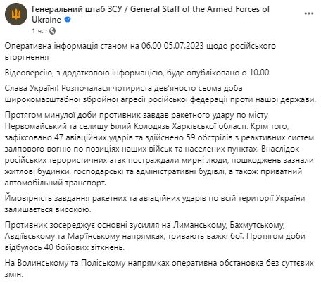 В среду, 5 июля, Генштаб ВСУ обнародовал сводку о ситуации на фронте.