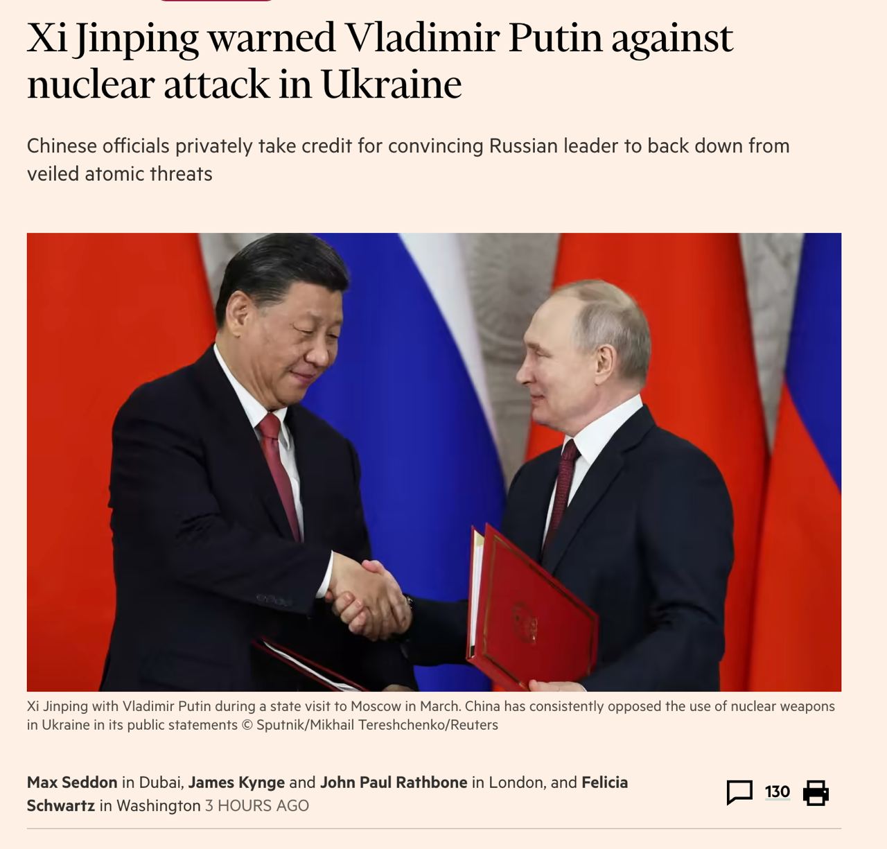 "С тех пор китайские официальные лица в частном порядке взяли на себя ответственность за то, что убедили российского президента отказаться от его завуалированных угроз применения ядерного оружия против Украины", - пишет FT.