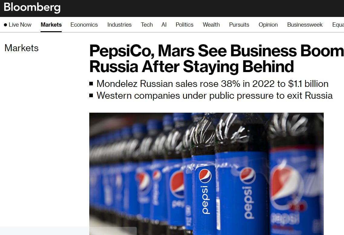 Выручка PepsiCo в России выросла на 16%, а прибыль увеличилась в четыре раза. Производитель газированных напитков заявил, что продажи в России принесут корпорации 5% консолидированной чистой выручки в 2022 году по сравнению с 4% годом ранее.