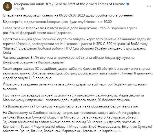 В субботу, 9 июля, Генштаб ВСУ обнародовал сводку о ситуации на фронте.